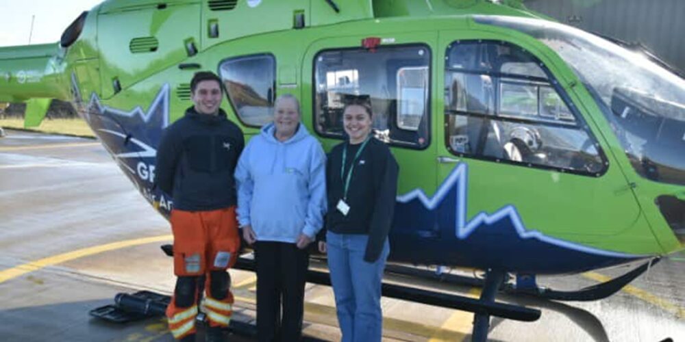 Pictured from left: Chief Executive Anna Perry, Air Operations Officer Vicky Brown, Senior Base Pilot Captain Jim Green, Chair Nigel Pickersgill, Critical Care Dr Scott Grier, Critical Care Paramedic Pete Sadler, John Christensen