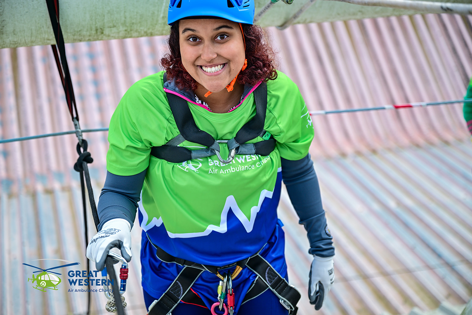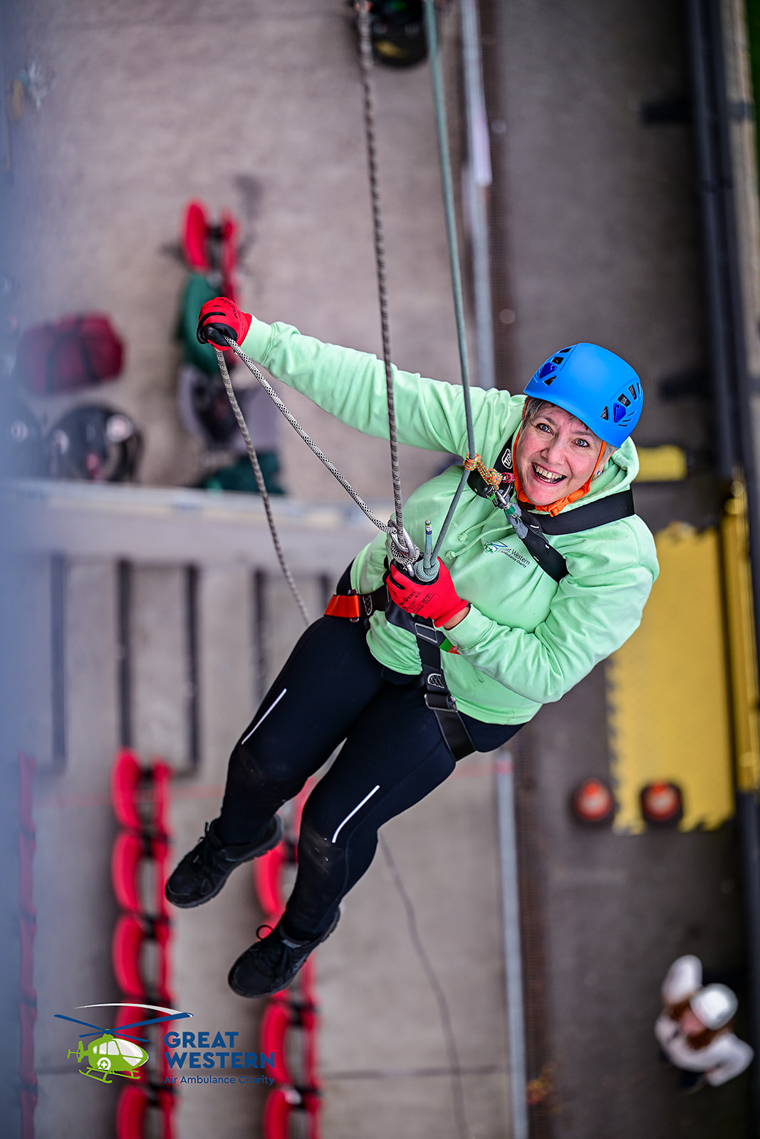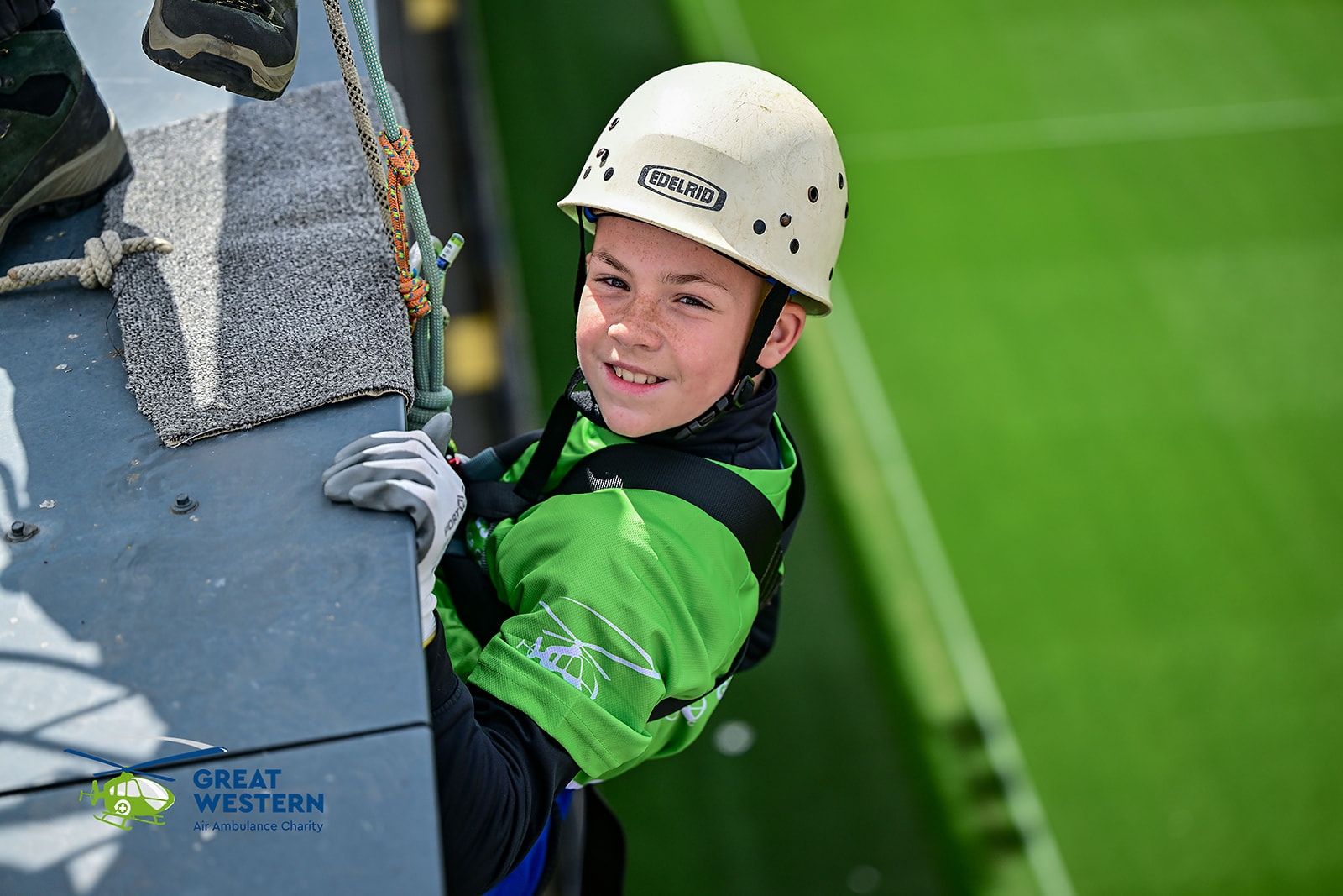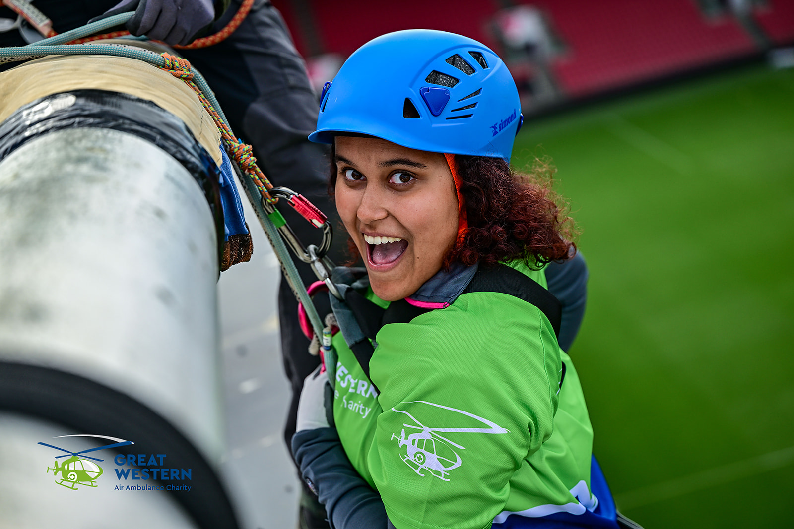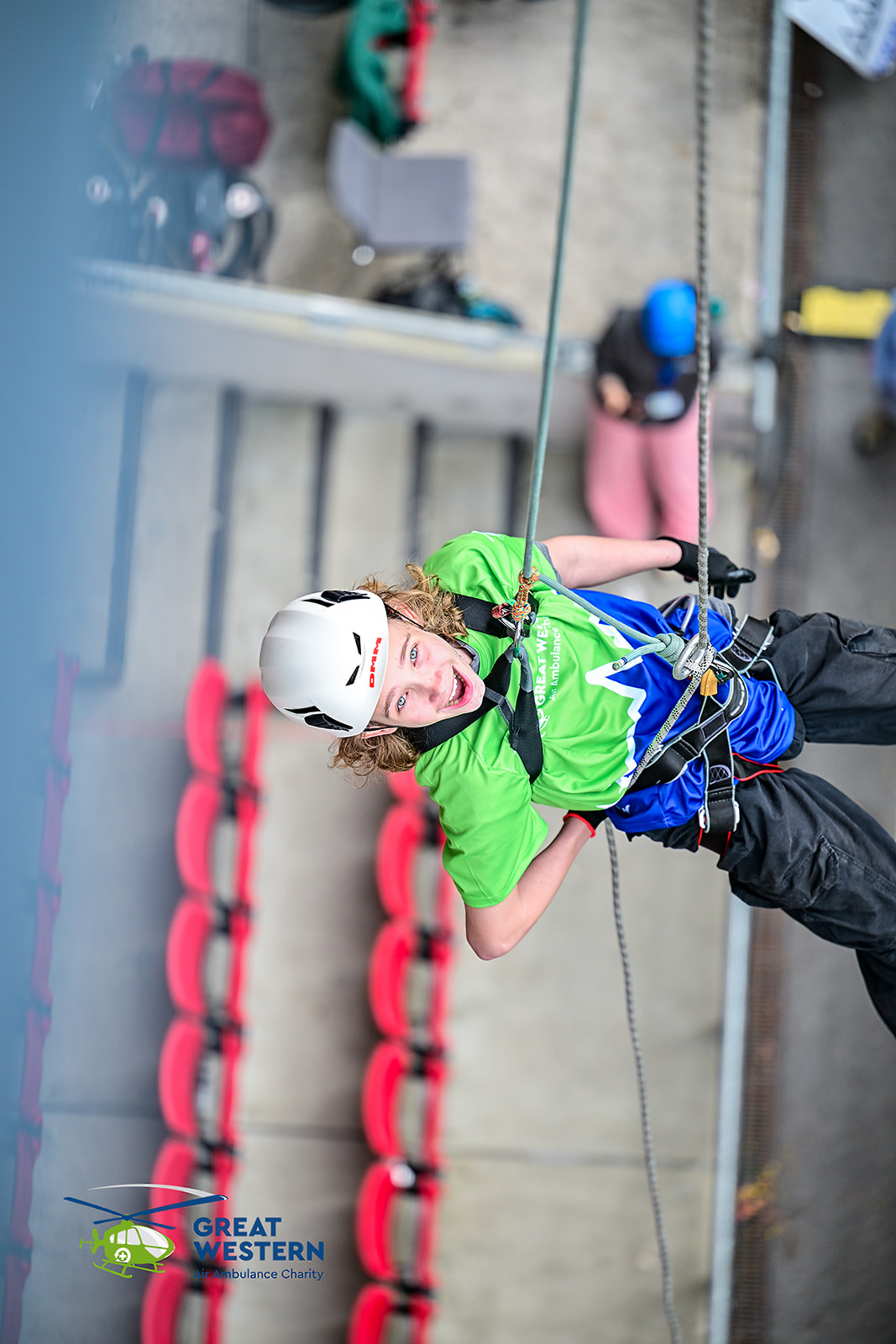 Accompanied by Critical Care Doctors Mike and Andrew, as well as SPCC Callum, a group that included former patients, GWAAC volunteers and families of former patients were strapped in on the roof of the stadium and bravely climbed over the edge to descend to the cheering crowd below.