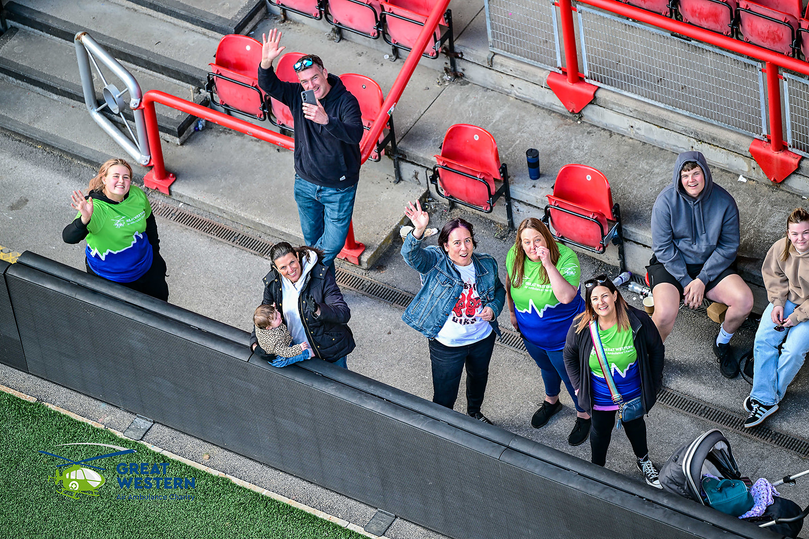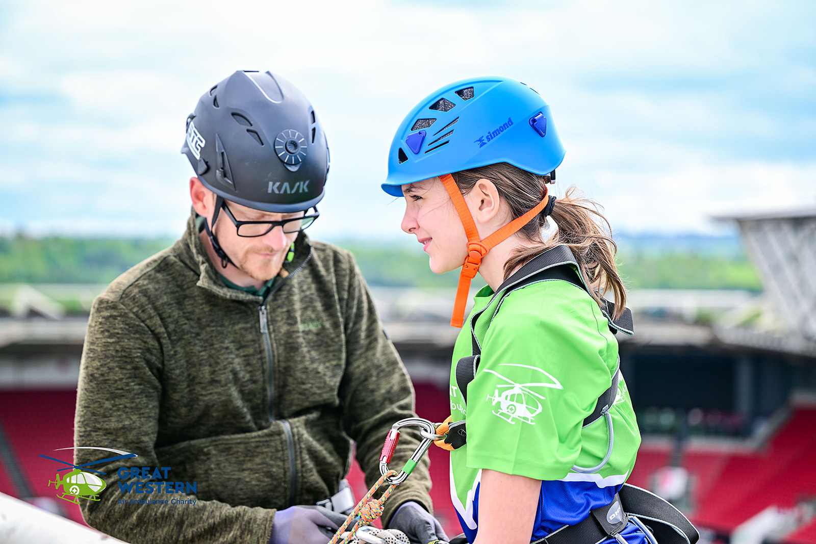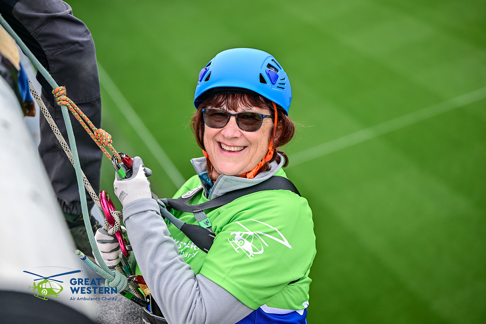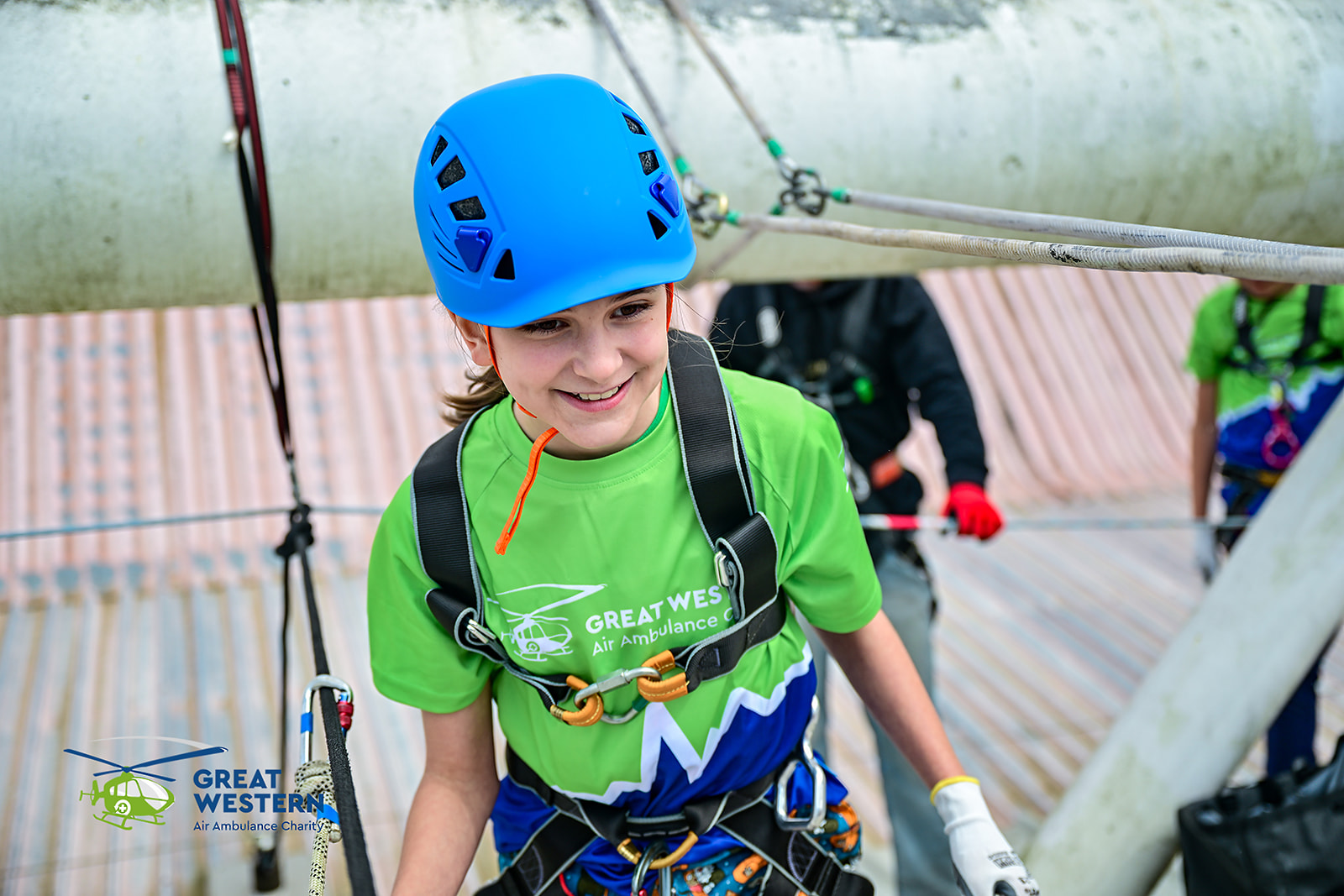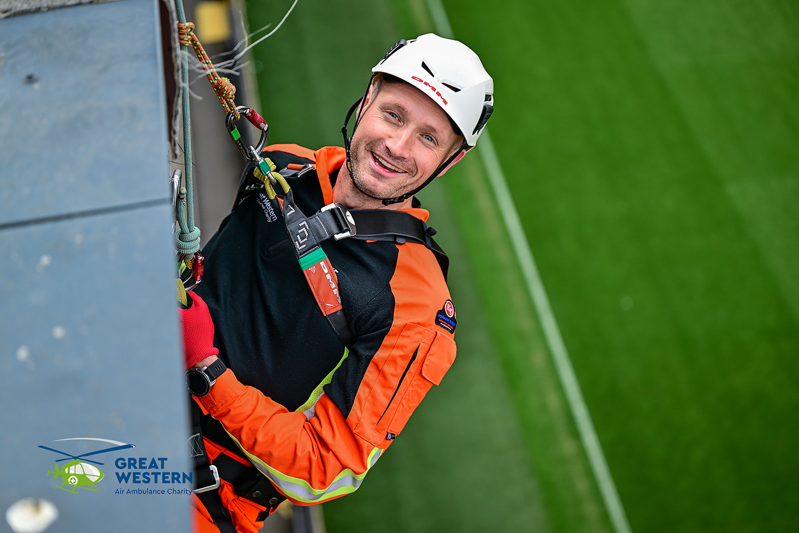 Accompanied by Critical Care Doctors Mike and Andrew, as well as SPCC Callum, a group that included former patients, GWAAC volunteers and families of former patients were strapped in on the roof of the stadium and bravely climbed over the edge to descend to the cheering crowd below.