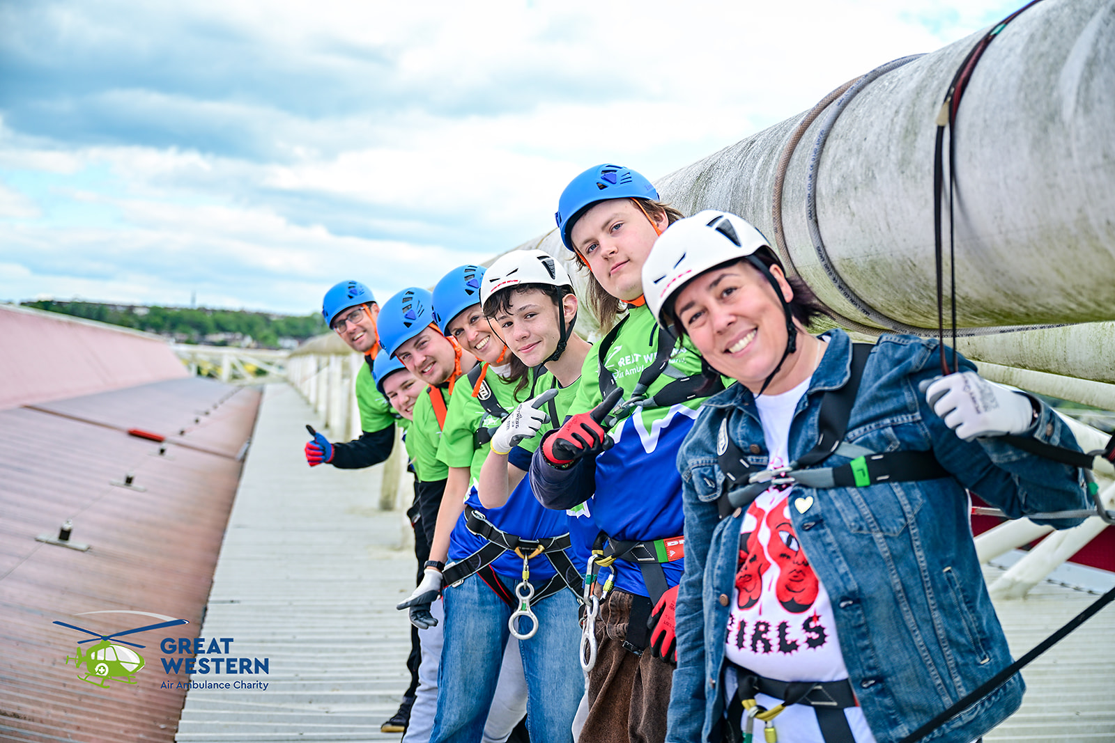 - Erika, Jo, Elye, Daisy, Daniel, Sally, Max, Ellie, Dan and Louis. A group of family and friends doing the abseil in memory of Erika’s Husband James who GWAAC attended in March 2025.