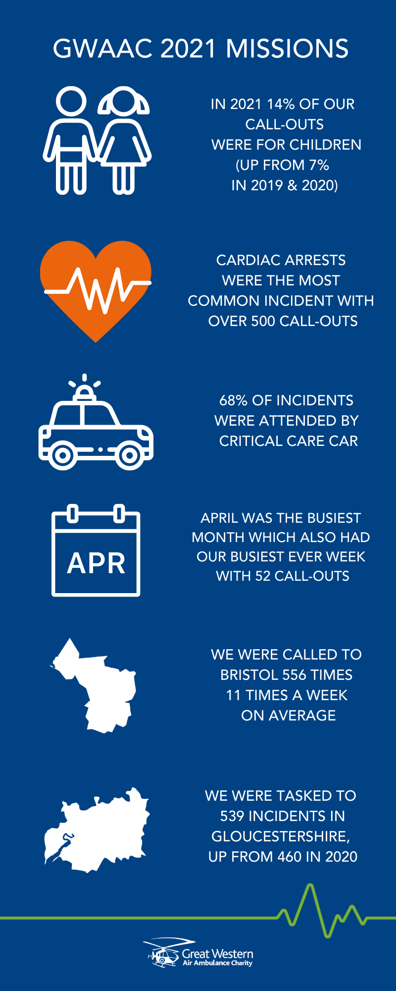 January 28, 20222021 was another busy and challenging year for the crew of Great Western Air Ambulance Charity (GWAAC). In fact, it was the second busiest year on record with a total of 1,964 call-outs. This means the crew responded to more than five incidents a day whilst continuing to deal with COVID-19 restrictions and PPE gear on top of their flight suits.