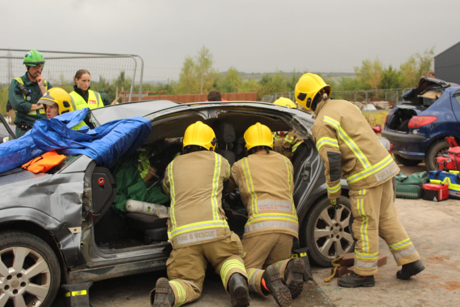 Following the brief, the fire crew and paramedics kicked into action to safely extract a casualty — a mannikin from an RTC. An added complication was that the casualty (the front seat passenger) had been impaled on a fence post inside the vehicle.