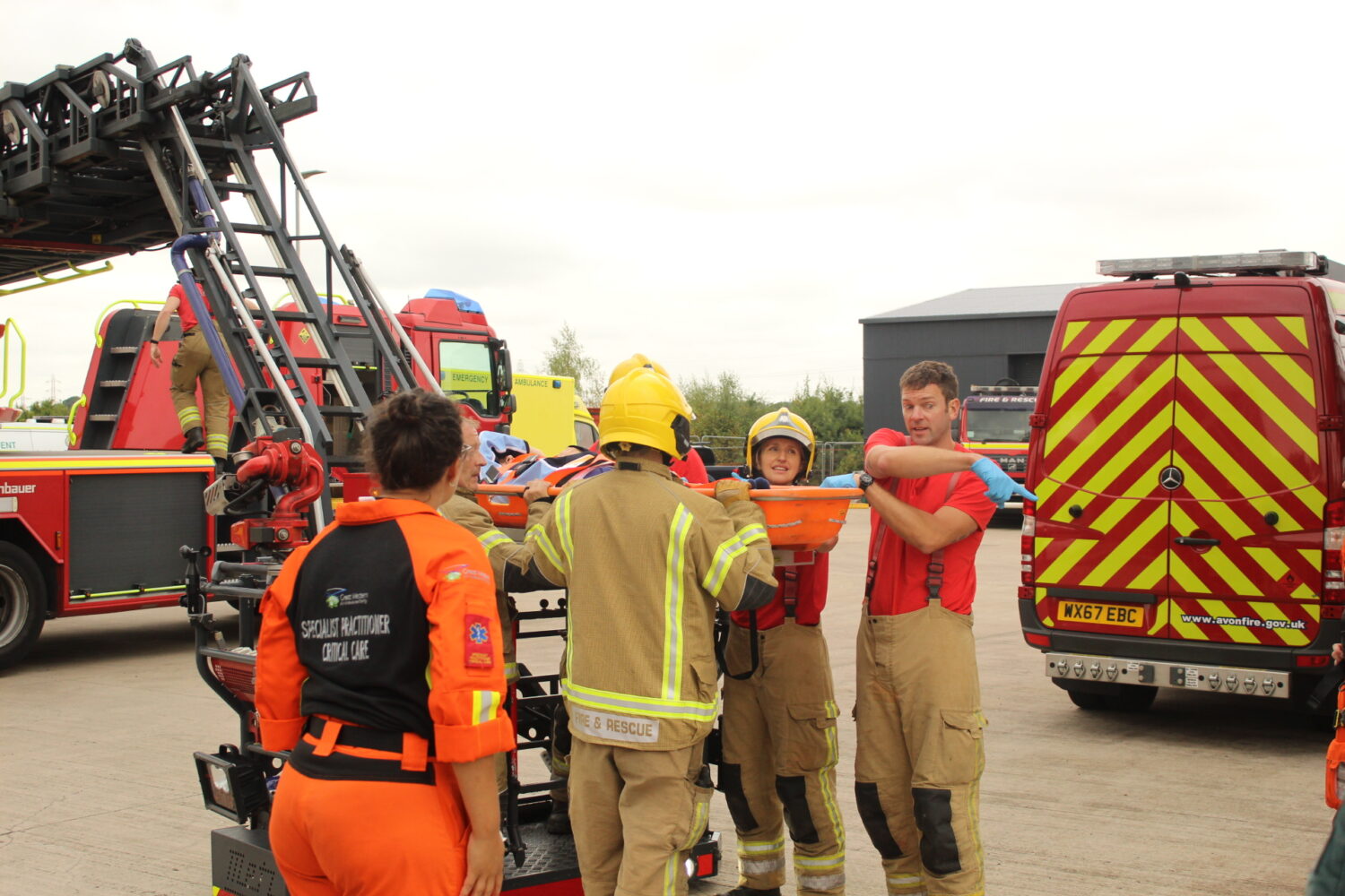 A casualty who had fallen down a lift shaft posed additional access problems for the group. The fire crew used a turntable ladder to gain access to the building and rope rescue equipment was used to lower a Critical Care Doctor and paramedics into the lift shaft. Our Critical Care Team provided guidance to the student paramedics on how best to treat the casualty.