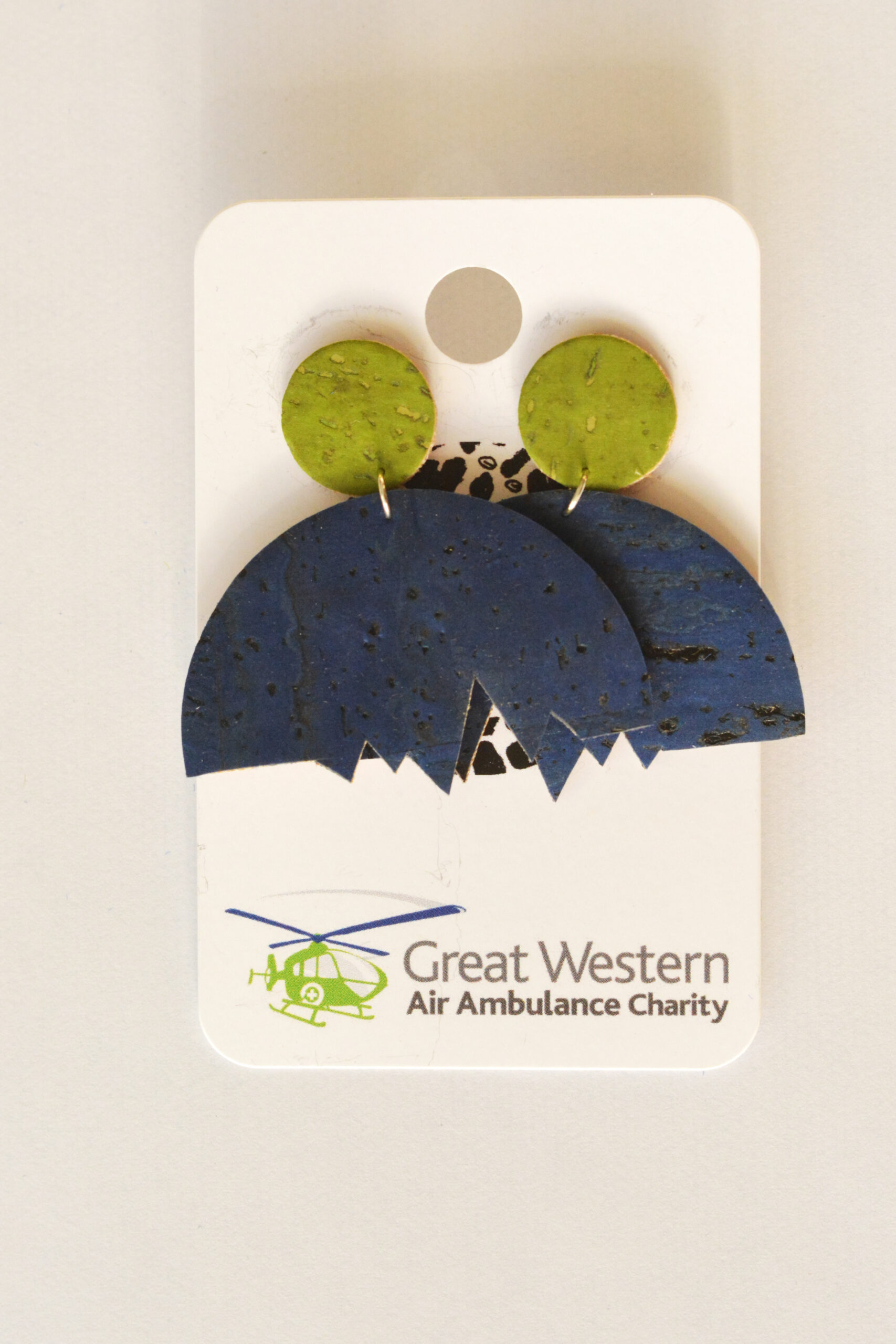 Handmade heartbeat ‘traceline’ cork earrings in GWAAC colours.