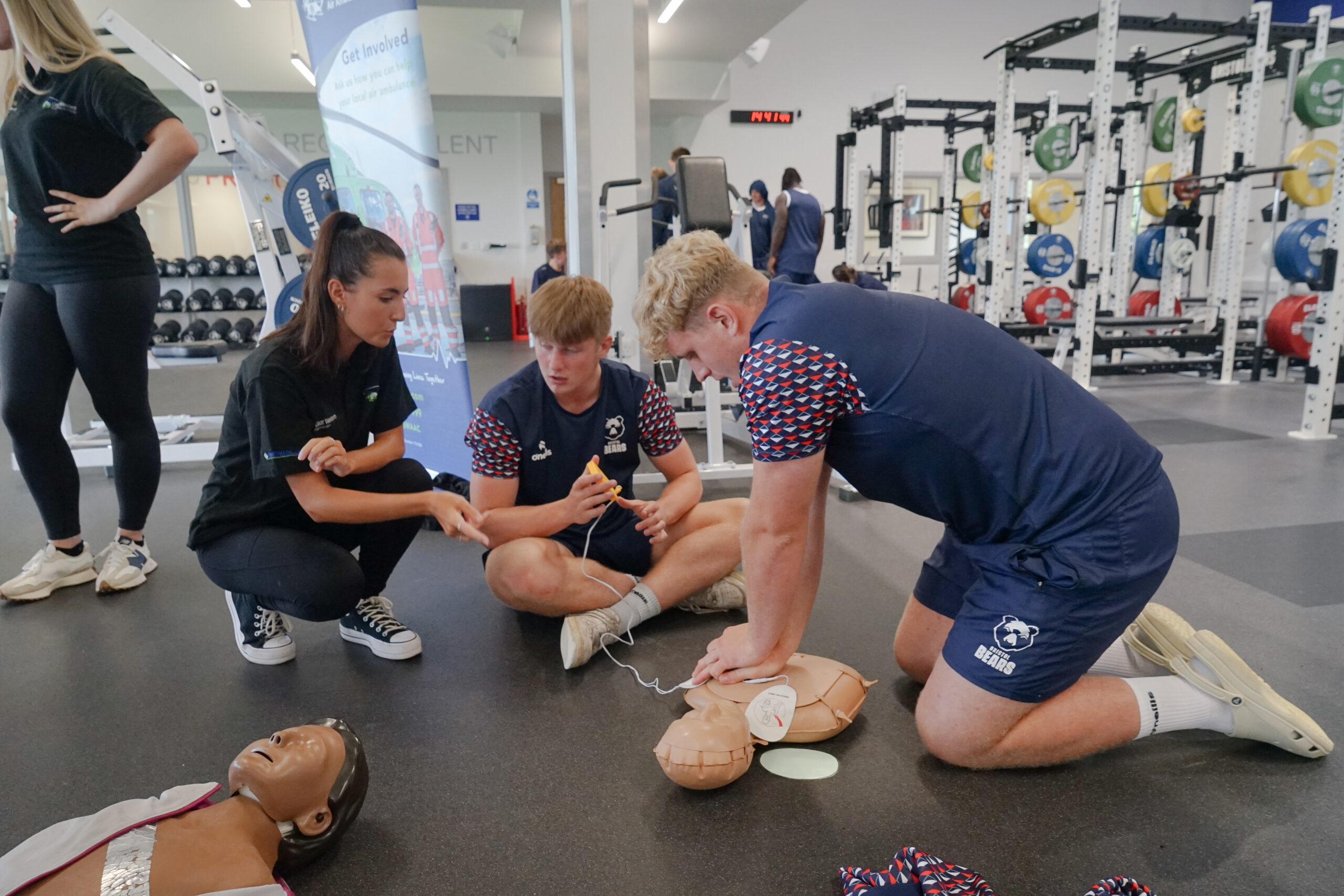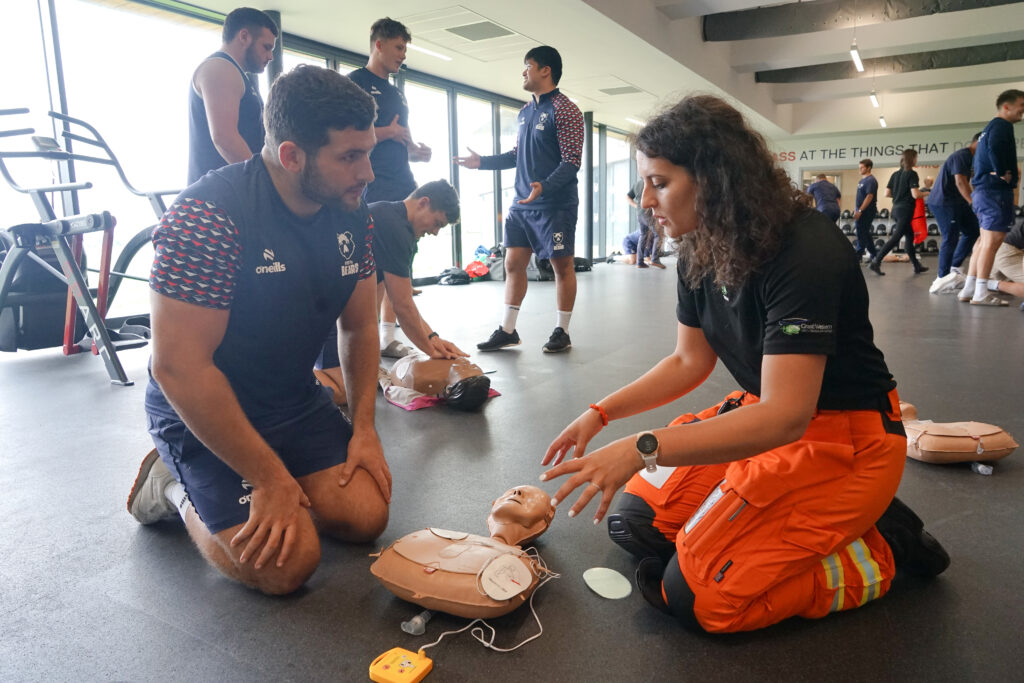 September 19, 2023On 8 August, the Great Western Heartstarters Volunteers returned to the Bristol Bears High-Performance Centre to teach two sessions of CPR and defibrillation. They first taught CPR to the Bears in 2021; this time around they were joined by Medical Director Andy Lockyer and Specialist Paramedic in Critical Care (SPCC) Fleur Rath.