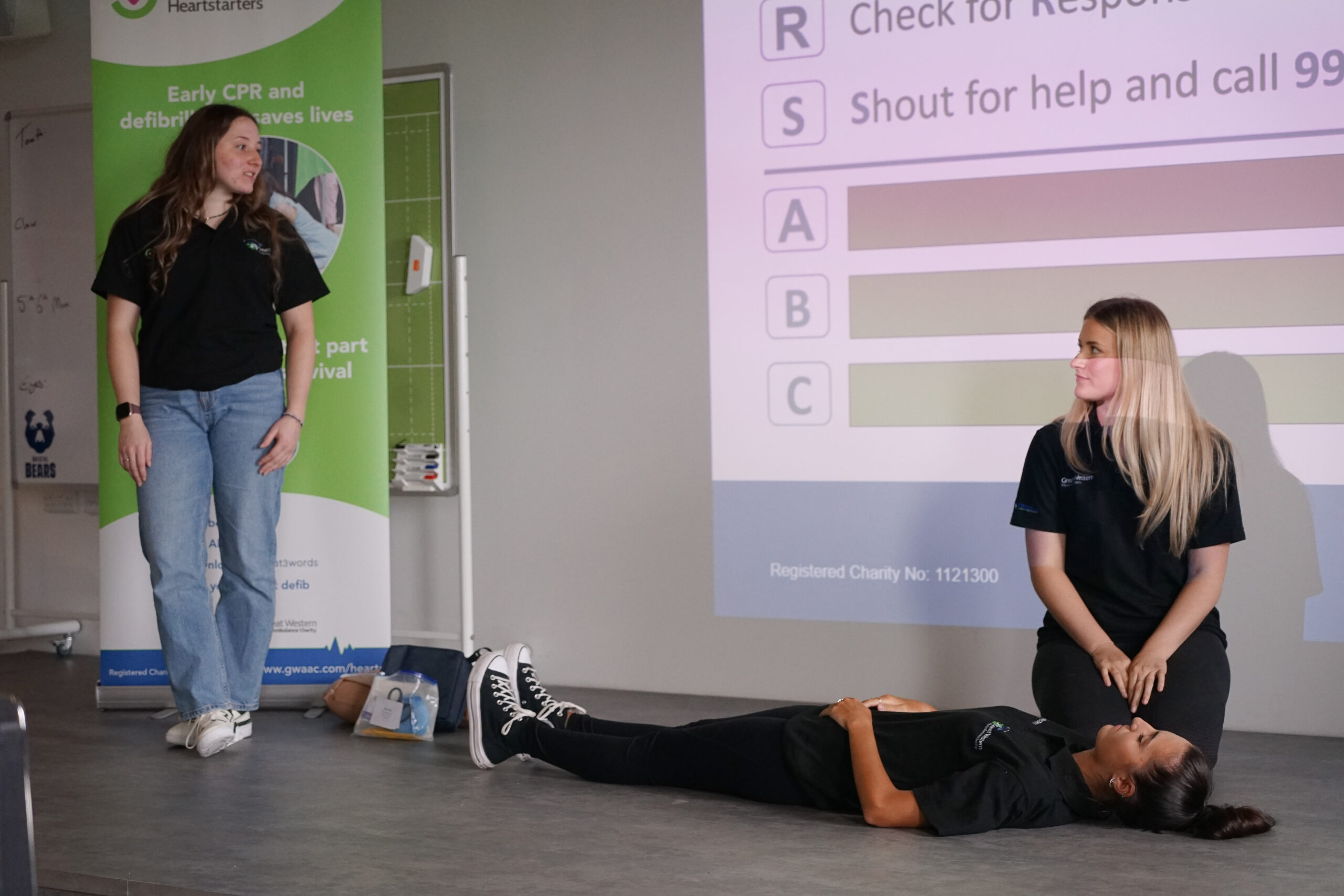 The Heartstarters volunteers then demonstrated the DRS ABC process on stage. Volunteer Jo was the patient, Ellie a UWE paramedic student, talked through what to do, and Hollie, a student nurse, demonstrated on Jo.